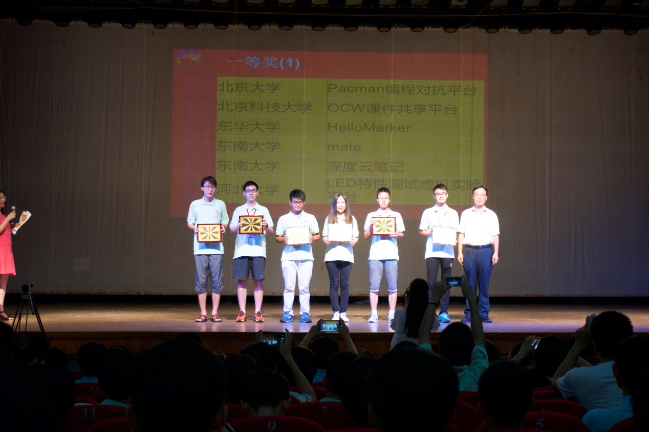 信安1301班的曹宇宁、物联1301班的王梧蓉、土资学院建环1301班白思琦共同开发的“OCW课件共享平台”获得软件应用与开发类决赛一等奖,该奖项得奖率约6%。此外,“课堂动力、动物那些事儿、诗经风韵、趣学形参传递、初中数学——全等三角形的判定方法、3D幻影互动、Transbest、奇妙的视觉欺骗、有一种游戏叫线性代数、《Faded》Launchpad MIDI控制工程”等10件作品分别获得微课与课件等5个类别的二、三等奖及优胜奖。