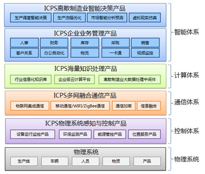 基于ICPS的离散制造业智慧生产系统是以大系统智能控制理论为指导,融合智能系统管理、自动控制、物联网、大数据技术、云计算技术、人工智能与知识工程前沿技术,形成智能信息物理融合系统(Intelligent Cyber-physical Systems,ICPS)的核心技术体系,为离散制造业生产系统的智能管理、调度、控制提供具体解决方案,即智慧工厂的整体解决方案;服务于制造业的生产调度优化、智能设备管理、节能减排与安全管理。