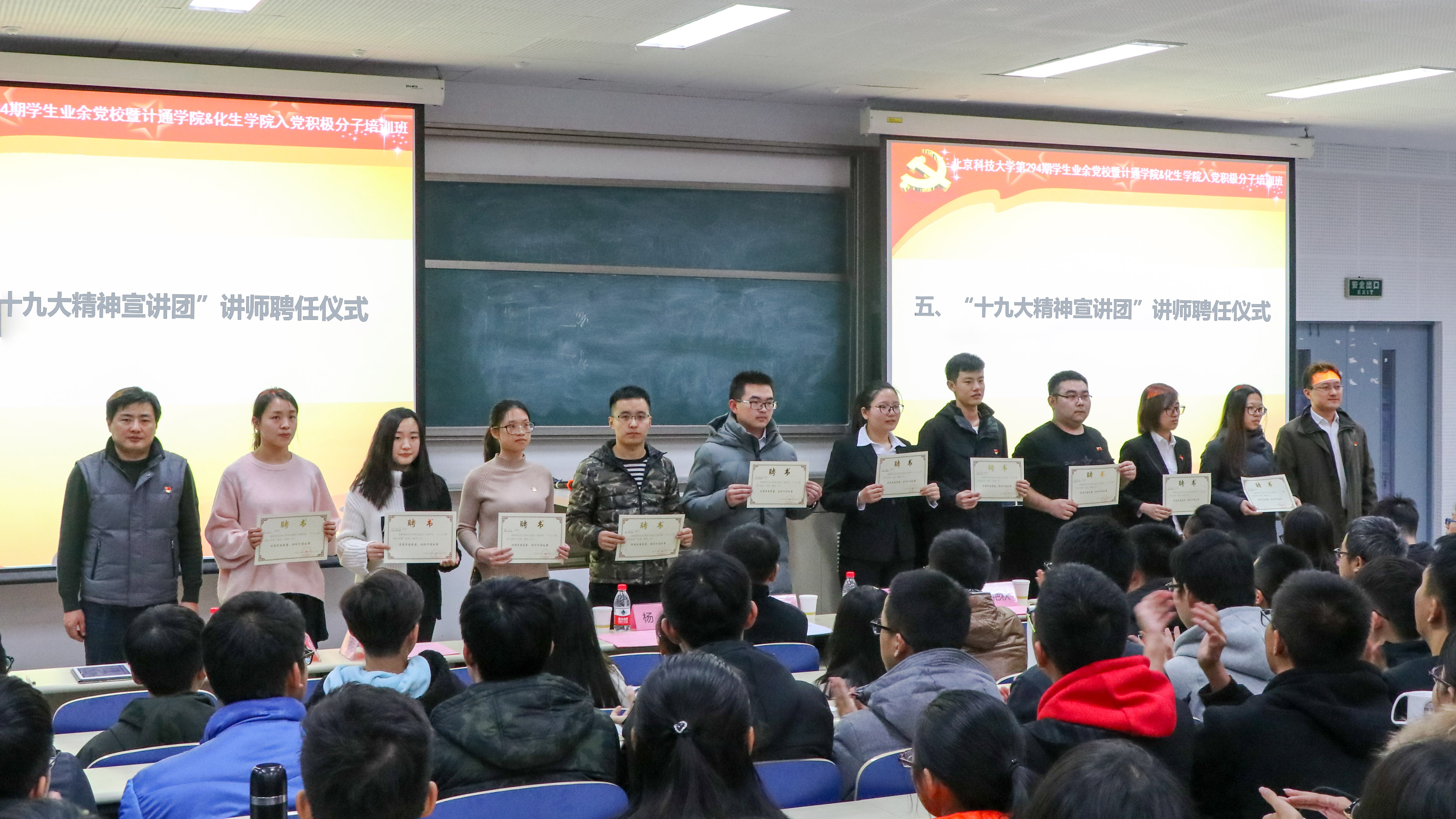与化生学院成立了“十九大精神”宣讲团,聘请了理论水平高、表达能力强的教师和同学担任讲师,并借此次机会进行了聘任仪式,由黄武南、郑安阳两位老师上台为十九大精神宣讲团讲师颁发聘书。随后,讲师代表姚航为大家带来了一场宣讲展示。