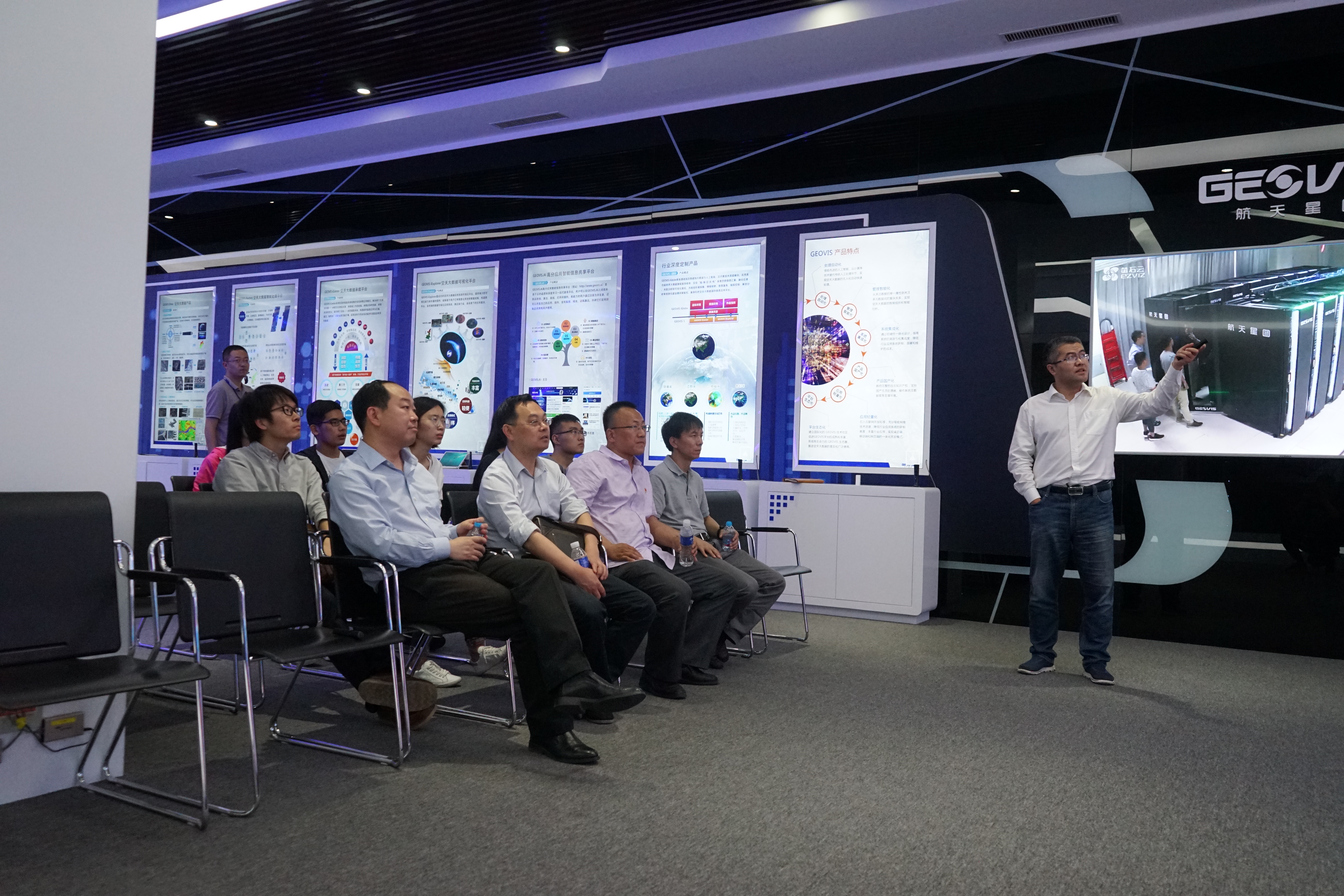师生代表先后参观了办公环境、GEOVIS数字地球展厅、GEOVIS系统演示厅,邵宗有详细介绍了GEOVIS 5产品特点, GEOVIS 5将空天大数据、云计算与人工智能计算深度融合,是新一代的空天大数据承载与智能服务平台,可承载国防、国土、交通等各类行业数据和专题服务,并提供智能化的大数据分析与综合可视化能力,同时面向地理空间领域,构建“GEOVIS+”的空天大数据应用生态圈。