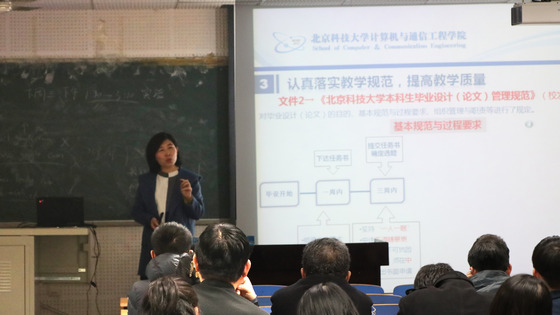 王建萍就全国思想政治工作会议相关会议精神进行了解读,带领大家学习了习近平总书记在会上的讲话精神,并强调,只有培养出一流人才的高校,才能够成为一流大学,必须要牢牢抓住全面提高人才培养能力这个核心点,坚持教书和育人相统一,坚持言传和身教相统一,坚持潜心问道和关注社会相统一,坚持学术自由和学术规范相统一,做到以身立德、以德立学、以德施教。随后,王建萍带大家逐条学习了我校本科课堂教学工作规范、毕业设计(论文)管理规范以及实习工作管理办法等教学规范制度,分析了学院教学工作中存在的问题,要求教师在工作中严格按照学校相关制度执行,规范教育教学流程,改进工作方式方法,提升教学质量。
