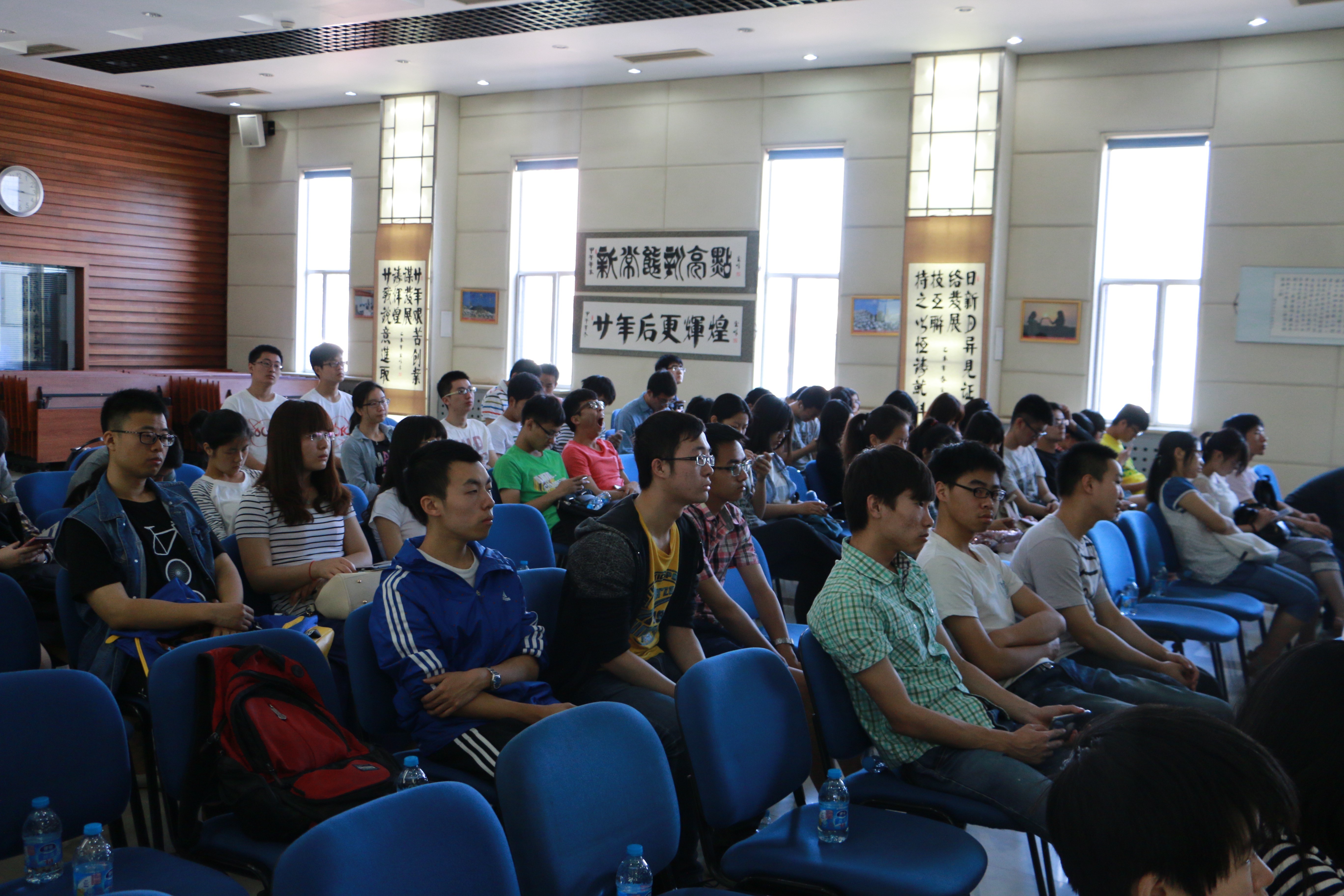 怀揣着对计算机前沿科学技术的向往,一行人乘坐公交车来到中科院软件园区。9时,中科院计算机网络信息中心科学日活动正式开始。首先,网络信息中心工作人员代表向我们致欢迎词,并提出参观时的注意事项。随后,网络信息中心的研究员们围绕数据分析作专题报告。主讲人准备充分,从中国科技网情况、GLORIAD及HKOEP的发展历程与现状、HK-Europe光网络在我们生活中的作用、生活中的高性能计算、从大数据到知识发现等方面向我们讲述数据分析的基础知识。为了加深同学们对数据分析的理解,主讲人将例子与理论结合,语言生动活泼,同学们听的津津有味,精彩的讲解引得会场掌声不断。每个报告结束后设有互动提问环节,同学们踊跃地提出自己的疑问,老师们都耐心地一一作答,现场学术交流氛围非常浓厚。