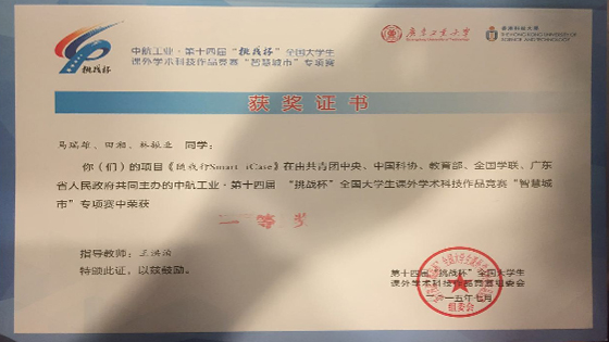 7月28日,第十四届“挑战杯”全国大学生课外学术科技作品竞赛“智慧城市”专项赛决赛在香港科技大学举行,来自我院的物联12班的马瑞雄、信安1201班的田湘和电信12班的林振业三名同学的作品《随我行 Smart iCase智能旅行箱》在决赛中获得了一等奖的佳绩,该项目由我院王洪泊副教授指导。