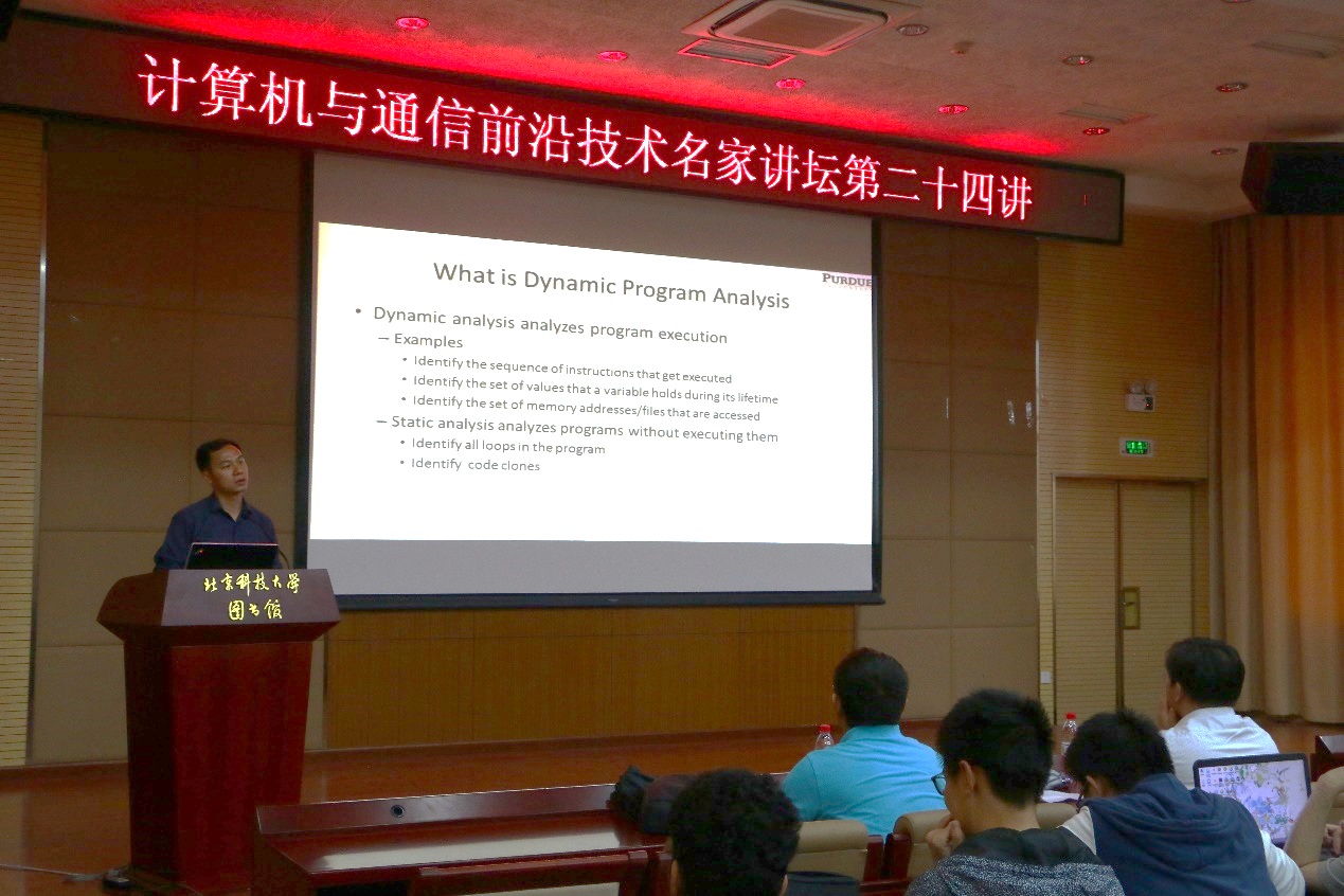 6月14日下午,计算机与通信前沿技术名家讲坛第二十四讲在我校图书馆四层报告厅成功举行。此次名家讲坛,我院邀请到了美国普渡大学张翔宇教授为广大师生带来题为“动态程序分析及其应用”的精彩学术讲座。 &nbs...