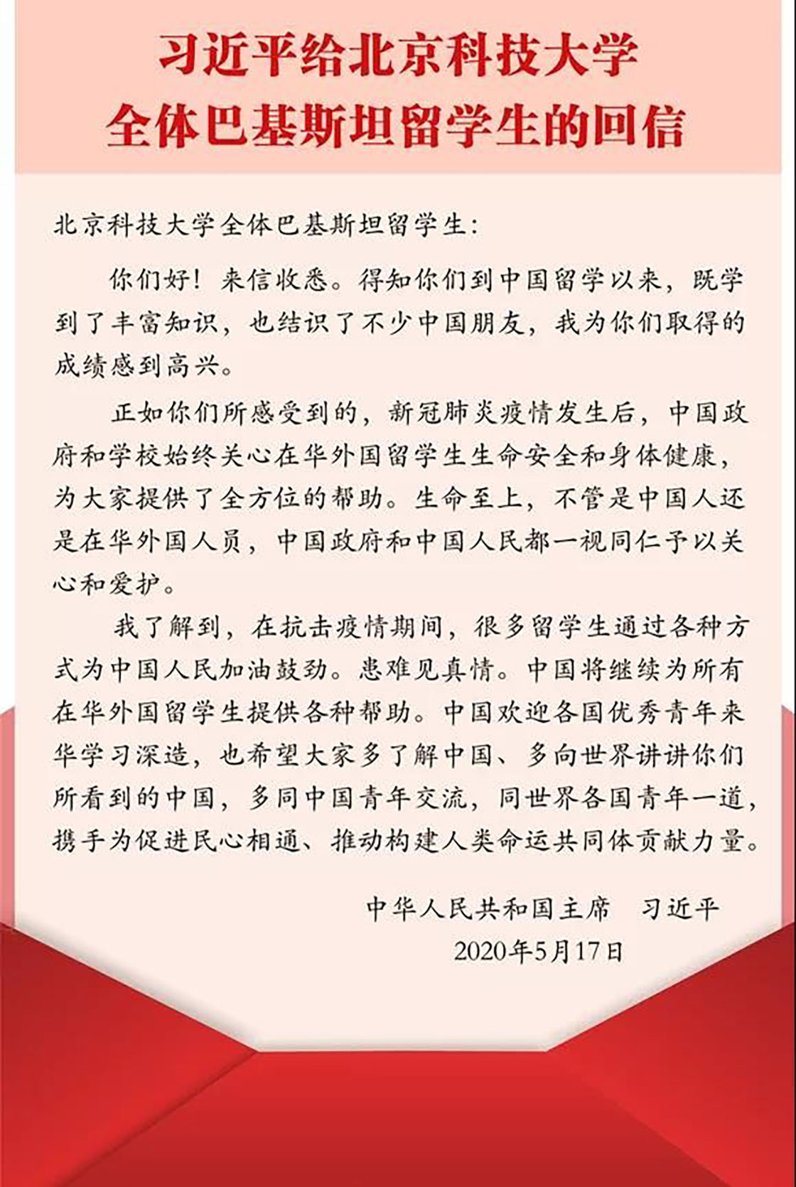 5月18日,新华社受权全文发布《习近平给裙底偷拍 全体巴基斯坦留学生的回信》。为学习贯彻习近平总书记重要回信精神,18日晚,裙底偷拍 举办“以重要回信精神为指引,开创学校事业发展新局面——裙底偷拍 师...